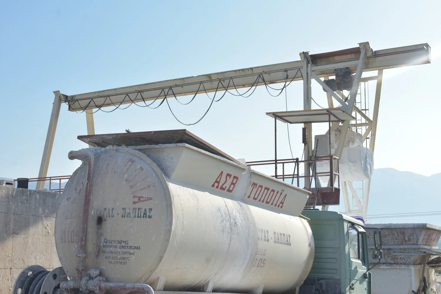 Συγκρότημα που Εγκαταστάθηκε στην Ασβεστοποιία Μ. Λάμπρου κ Ζιώγα Λ. Παπά. Αποτελείται Τροφοδότη Δονητικού Τύπου για την Αποθήκευση του Ασβέστη στην Αρχική του Μορφή (πέτρα), Μεταφορική Ταινία για τη Μεταφορά του στην Βαρέλα, τον Κάδο Παραγωγής Ασβεστοπολτού (Βαρέλα) που Πολτοποιεί τον Ασβέστη, το Σύστημα Διαλογής και Εναπόθεσης του Ασβέστη στους Λάκκους και την Γερανογέφυρα με την Αχιβάδα Συλλογής του Ασβεστοπολτού από τους Λάκκους. Στη Φωτογραφία Απεικονίζεται το Βυτίο Μεταφοράς Ασβεστοπολτού για την Μεταφορά Ασβεστοπολτού στα Εργοτάξια.